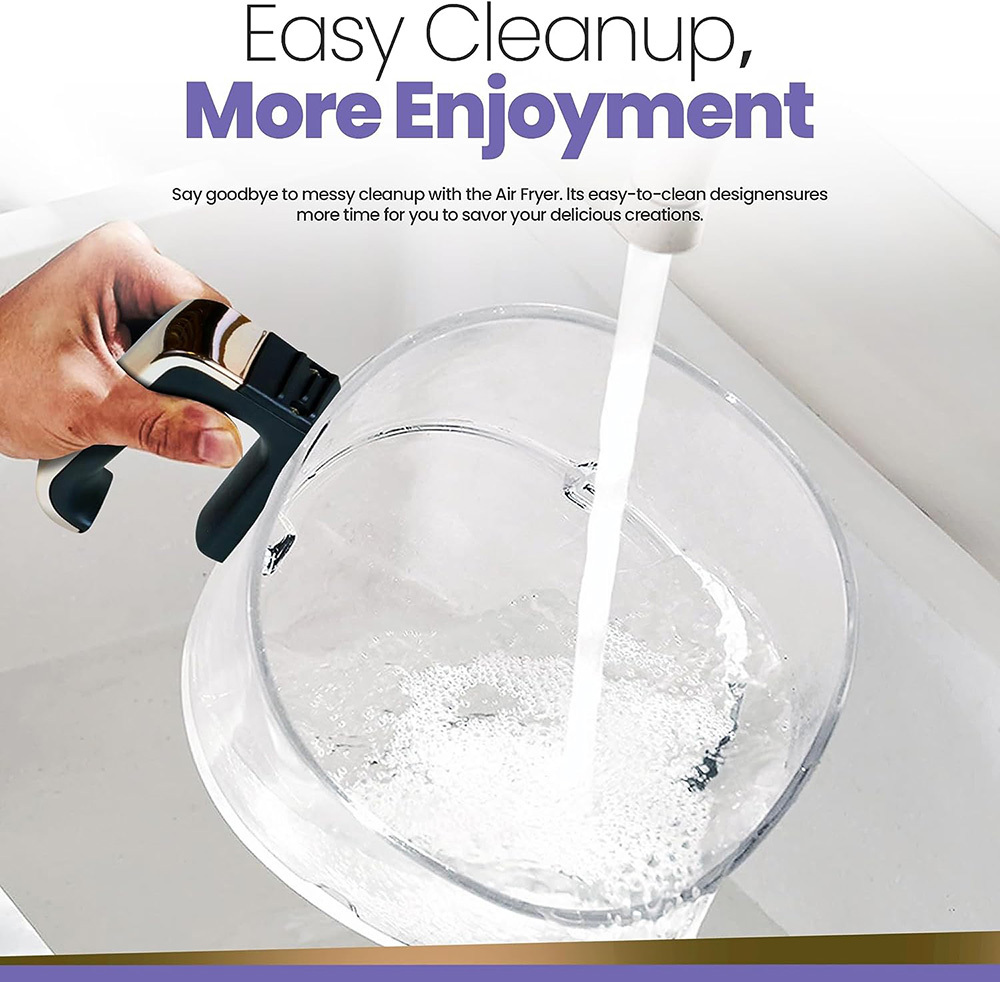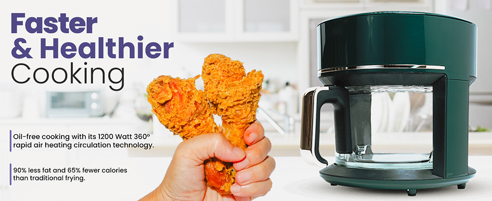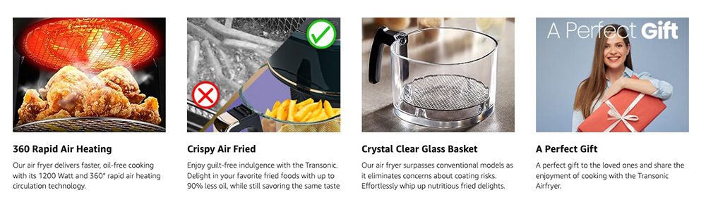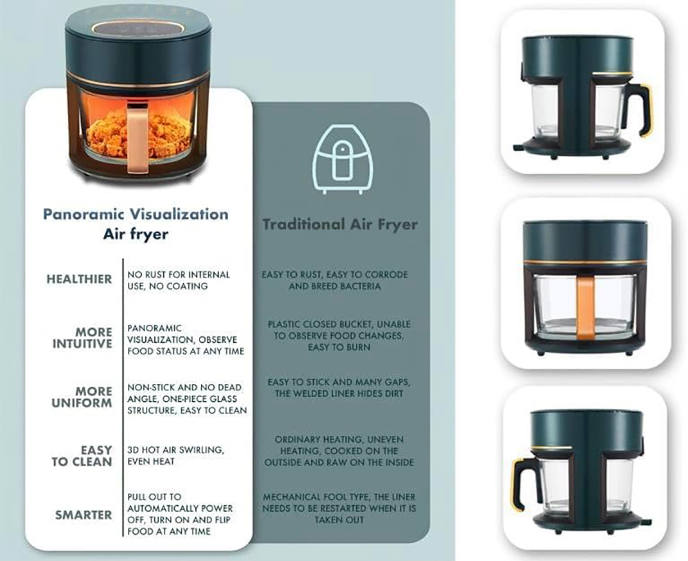 - [Crystal Clear Glass Basket Air Fryer] Delight in wholesome cooking with Transonic uncoated, non-stick glass basket air fryer. Its 180° visible cooking window lets you witness the entire process, while the ergonomically designed handle ensures a secure, comfortable grip, having undergone rigorous testing for durability. Elevating beyond traditional models, our air fryer eliminates coating risks, effortlessly crafting nutritious fried delights for your loved ones.