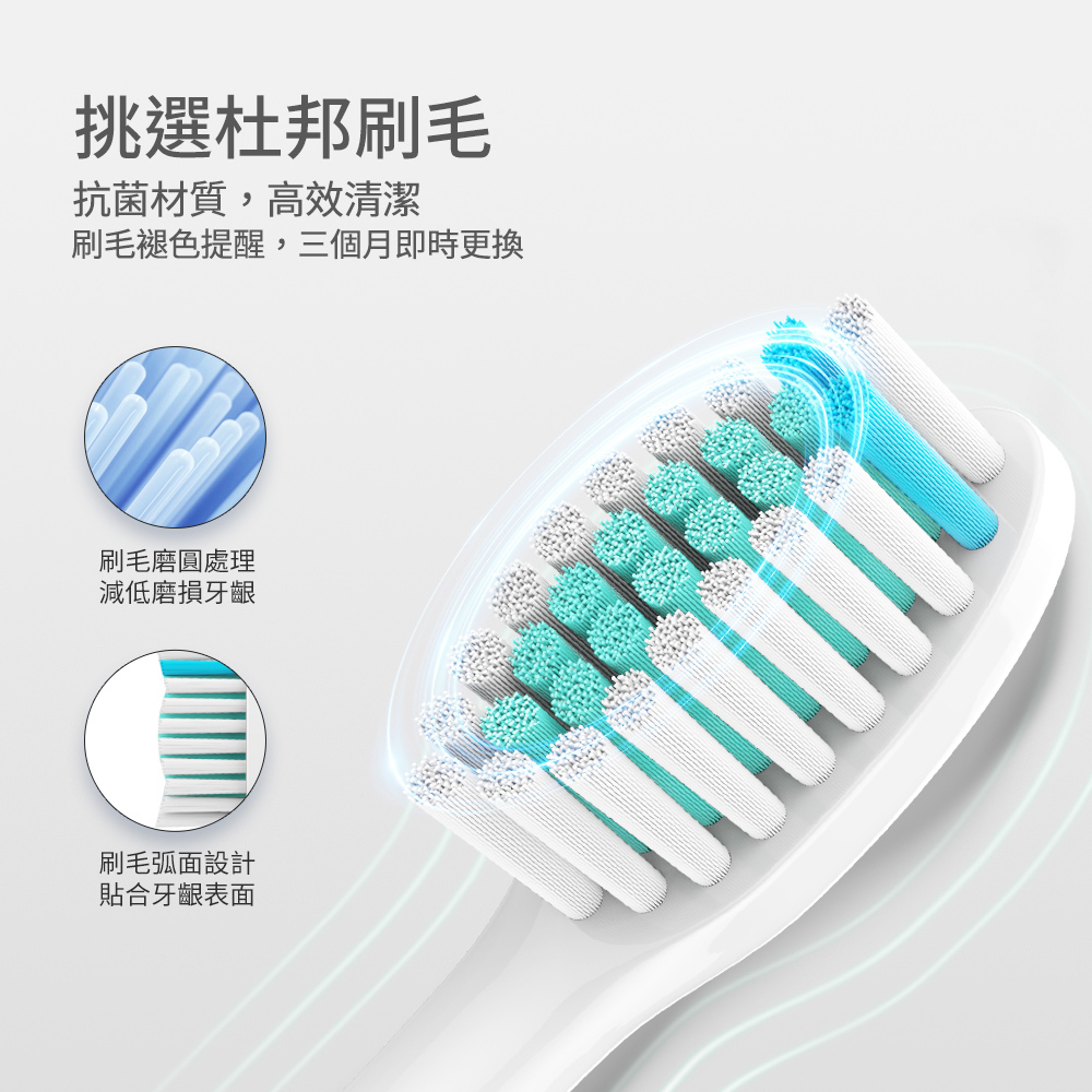 *選擇杜邦牙刷毛,減低磨損牙齦,弧面設計貼合牙齒