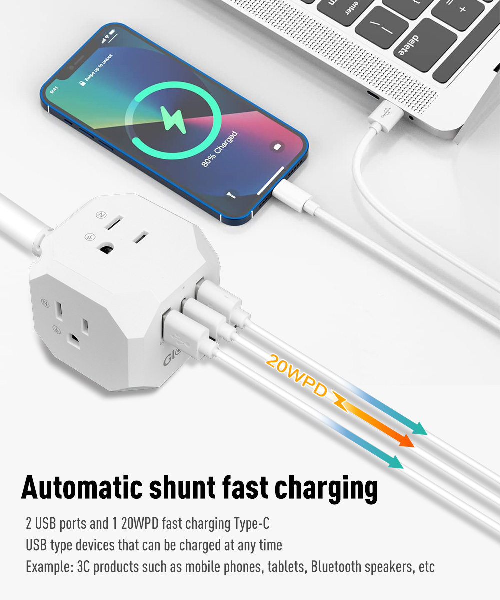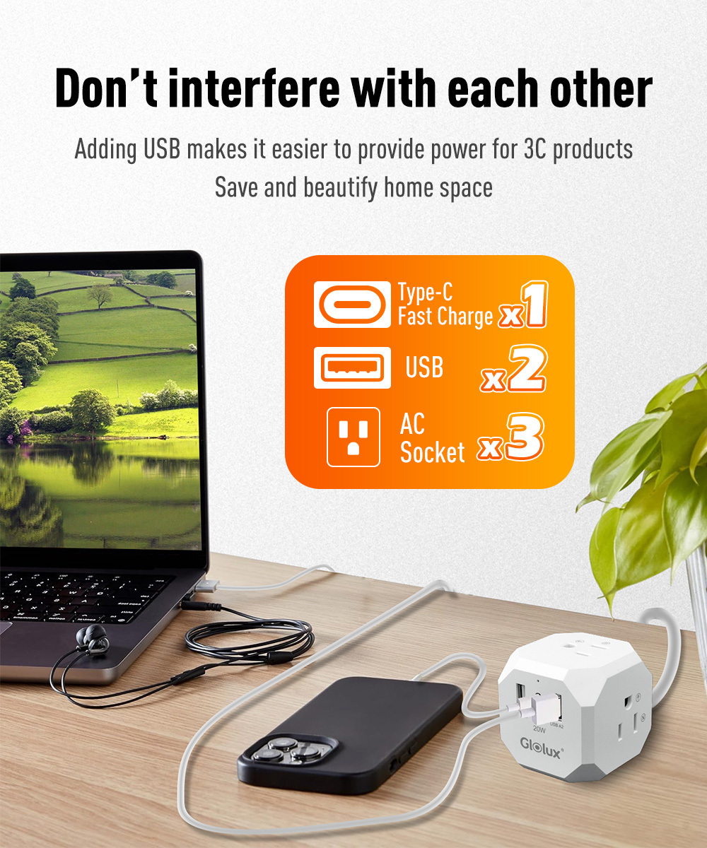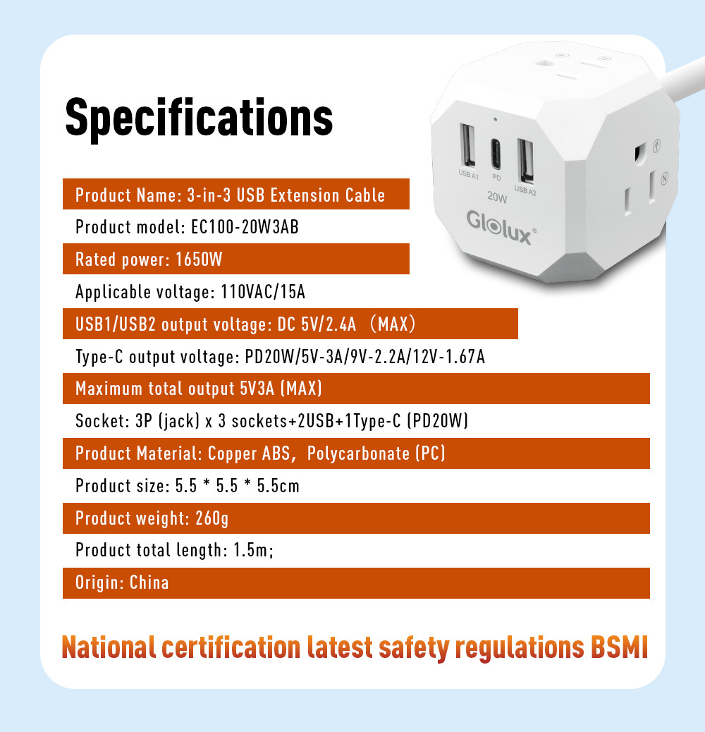 Specification - Rated power: 1650W - Applicable voltage: 110VAC / 15A - USB1/USB2 Output voltage: DC 5V/2.4A (MAX) - Type-C output voltage: PD20W/5V-3A/9V-2.2A/12V-1.67A - Total output MAX 5V3A(MAX) - Socket: 3P(jack) x 3 socket + 2USB + 1Type-C(PD20W) - Material: Copper, ABS, Polycarbonate (PC) - Product size: 5.5*5.5*5.5cm - Product weight: 260g - Product line length: 1.5m |