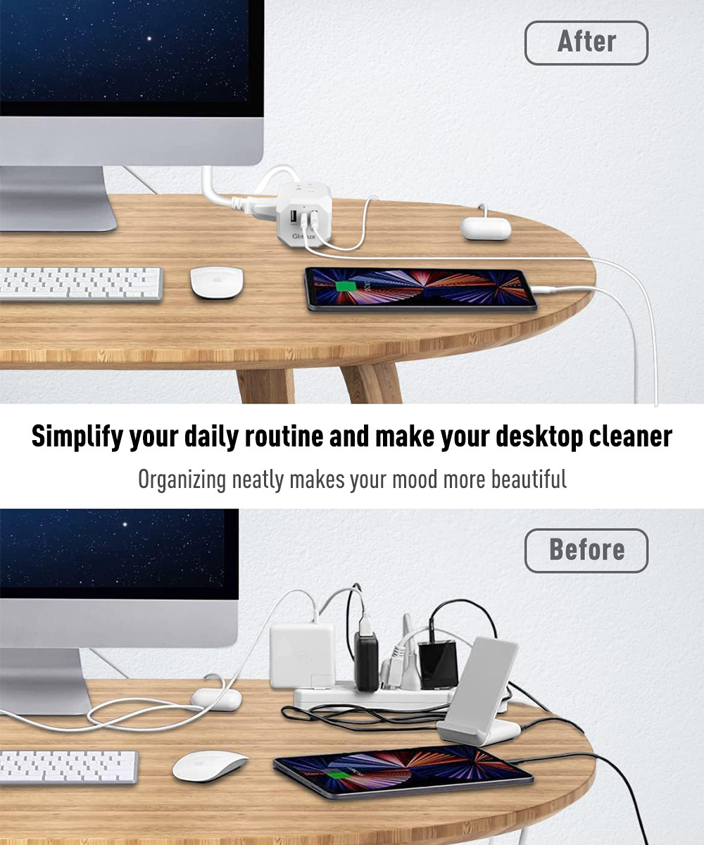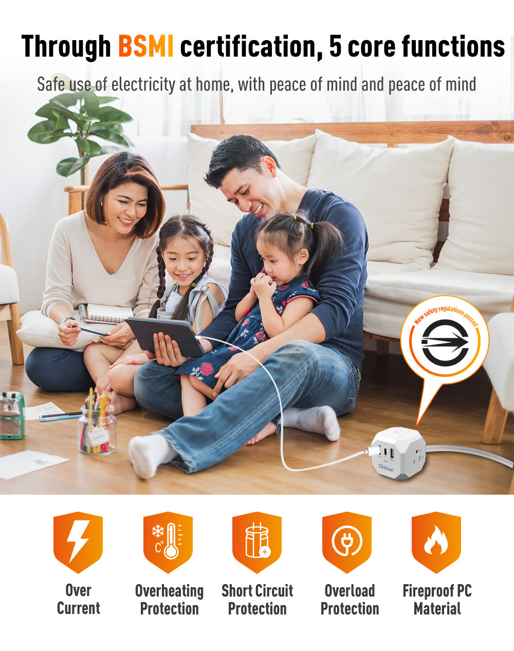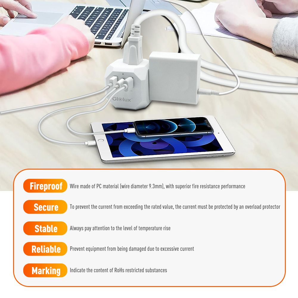 Specification - Rated power: 1650W - Applicable voltage: 110VAC / 15A - USB1/USB2 Output voltage: DC 5V/2.4A (MAX) - Type-C output voltage: PD20W/5V-3A/9V-2.2A/12V-1.67A - Total output MAX 5V3A(MAX) - Socket: 3P(jack) x 3 socket + 2USB + 1Type-C(PD20W) - Material: Copper, ABS, Polycarbonate (PC) - Product size: 5.5*5.5*5.5cm - Product weight: 260g - Product line length: 1.5m |