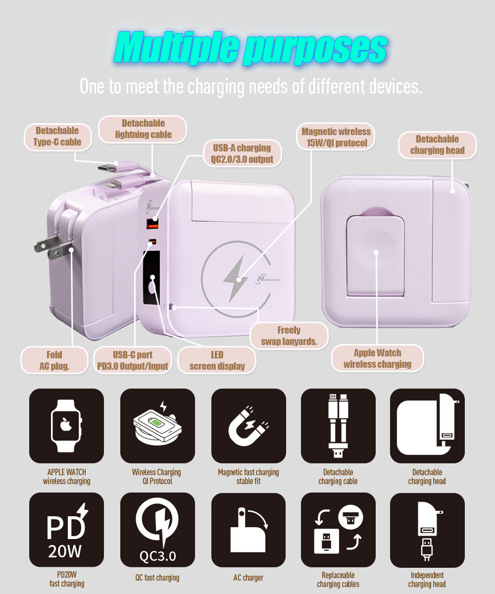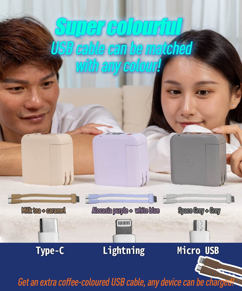 - 2 kinds of self-contained cables + dual-port output, supporting up to five devices charging at the same time