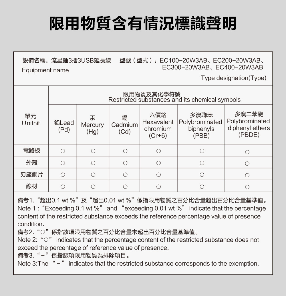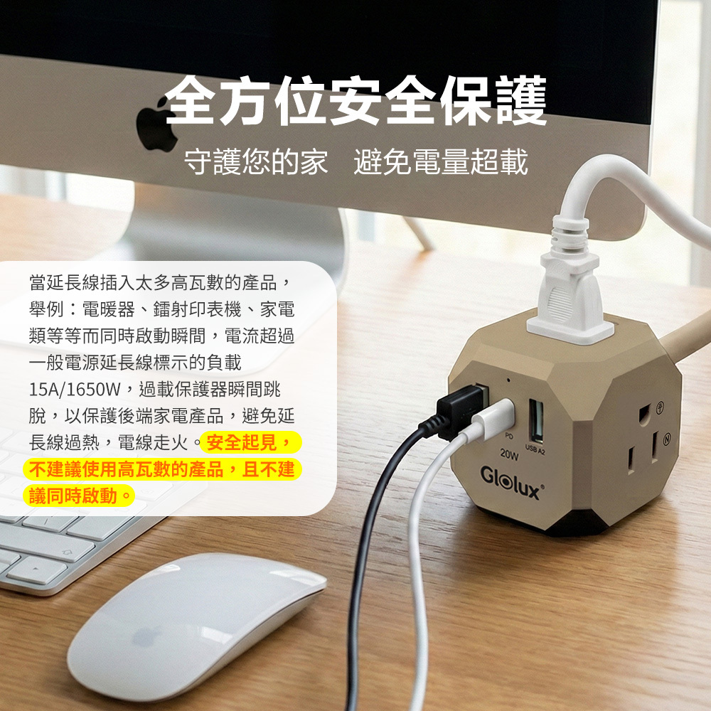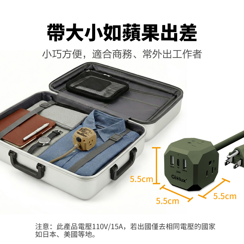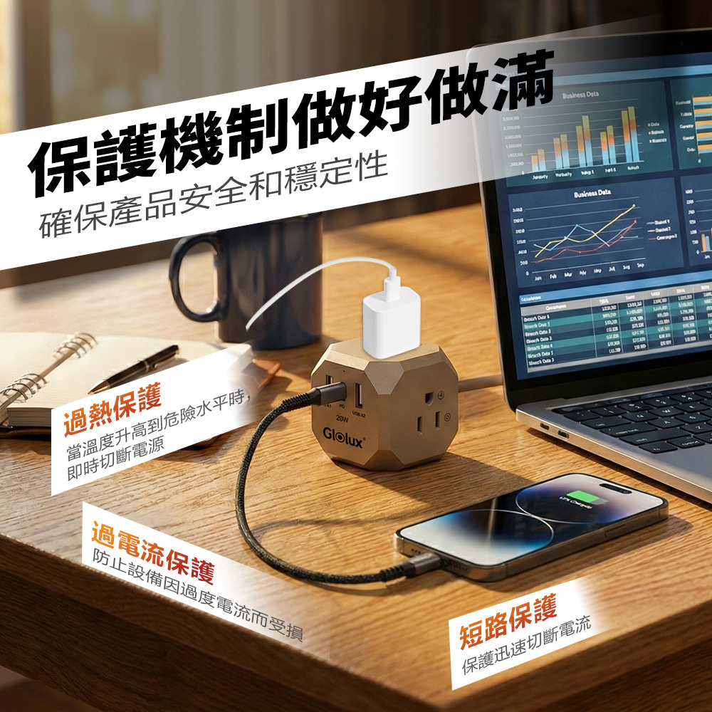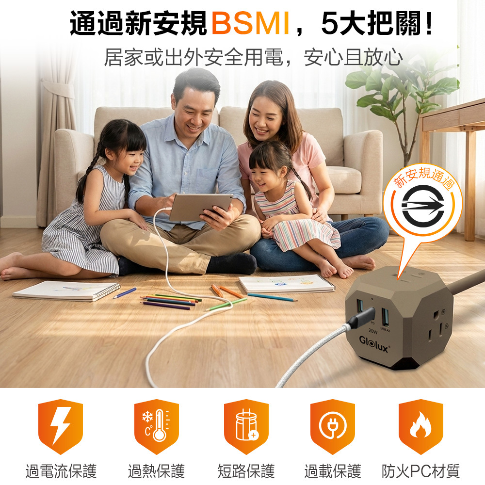 Glolux 流星錘 3面插座3孔3P插頭+2USB + 1Type-C(PD20W)延長線1.8M(6尺) (EC300-20W3AB)